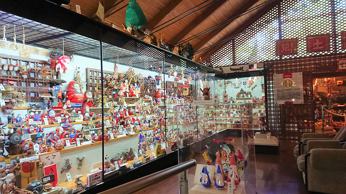 館内には昭和初期の人形親善使節「青い目の人形」、東北六県の代表的な伝統こけし、日本各地の匂いと色合いを伝える張り子、土人形、凧、面、土鈴など伝統玩具。絵馬など伝統習俗や暮らしに根ざした品々。文楽、文弥、歌舞伎人形などの芸能人形類。船の模型や東南アジアの民族品。玩具関係書籍のほか、歴史と風土の香りを豊かに感じていただける品々が展示されています。