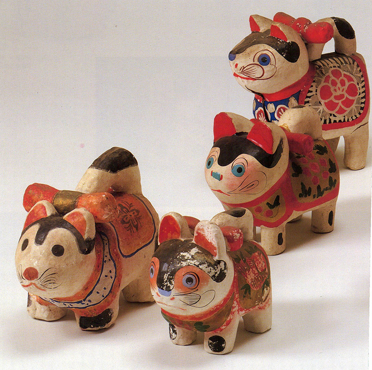 その彩色や形には名もない職人達が、心をこめて仕上げた素朴な匂いがします。古びた中にもいきいきと、暖かな人形達をお時間の許す限りご覧ください。
